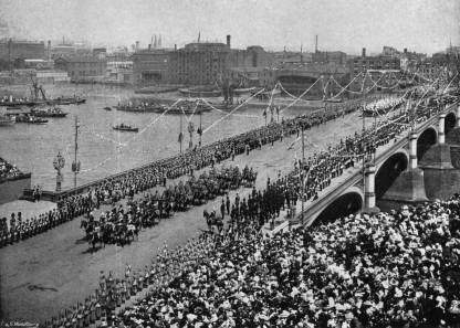 There are still to be witnessed in the Queen’s realm those violent contrasts between vast wealth and grinding poverty, which must ever arise in every civilised State in periods of great commercial and productive activity. They are a standing perplexity and distress to philanthropists; but one of the brightest features in the reign of Queen Victoria, of infinitely deeper significance than the accumulation of riches by the nation and by individuals, is the degree to which that wealth has penetrated the middle and industrial classes.