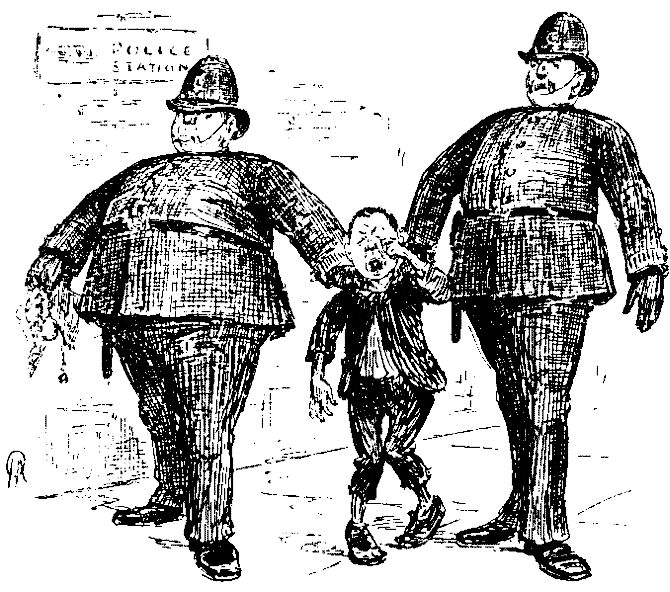 Fifth B. (pathetically). Don't leave your little Freddy out! (They don't leave their little Freddy out.) Cheer up, William, there 's 'appier days in store; there'll be Jersey comin' soon. We'll be orf to the sunny south! (To a stranger who comes up to him.) Why, Uncle, you don't say it's you! How well you're looking! Shake 'ands and 'ave a bit on, jest for ole sake's sake! (The stranger proceeds to introduce himself as the Secretary, and to demand a fee.) What! pay you five shillins for standin' 'ere wastin' my time and voice like this? Not me! Why, I aint took two blessed sorcepans since I bin 'ere! (The Secretary remains firm.) I won't do it, my boy. Not on prinserple, I won't. I wouldn't give you five shillins not if your tongue was 'anging down on to your boots—so there! (The Secretary does not attempt so violent an appeal to his better nature, but calls a police-inspector.) 'Ere, I'd sooner git down and chuck the show altogether; jest to mark my contempt for such goings on! (He descends from his box; takes down his sign, unscrews his pole, folds up his professional triptych, and departs in a state of virtuous indignation only to be expressed by extreme profanity, while the Secretary proceeds unmoved to collect payments from the others; who eventually compromise the claims for half-a-crown.)