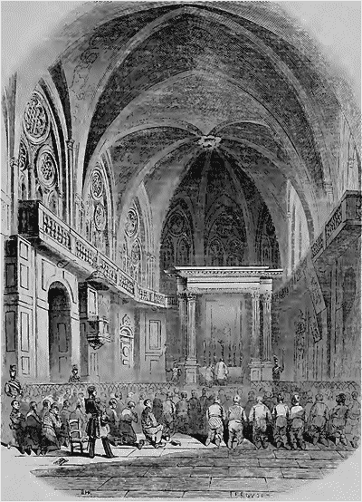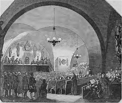Le lieu de la scène est tout à fait dramatique et prête aux mystérieuses conjectures. Figurez-vous un immense caveau dont les sombres profondeurs s'étendent dans les entrailles d'un temple divin: par exemple l'église Saint-Sulpice. Là, à certains jours, s'assemble une foule considérable d'hommes de tout rang, de toute condition et de tout âge, depuis l'adolescent jusqu'au vieillard, et de la simple veste de l'ouvrier à l'habit de drap fin. Des lampes suspendues aux voûtes jettent une lumière fantastique dans la nuit de ce noir caveau; alors les assistants prennent place sur des bancs symétriquement rangées, et il est aisé de voir à leur attitude qu'ils obéissent à une sorte de hiérarchie et de discipline. Chaque banc, en effet, est divisé, pour ainsi dire, en compagnie de dix personnes soumises à un chef. Sur le fond de cette assemblée, vêtue en majorité du costume laïque, se détachent des prêtres et des frères de la doctrine chrétienne. Ceux-là surtout semblent avoir l'autorité et prendre une part active dans ses réunions.