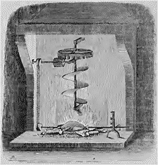Remarquons en outre l'analogie frappante, ou plutôt la similitude parfaite qu'il y a entre l'appareil propulseur hélicoïdal qui paraît avoir un si grand avenir dans la navigation à vapeur et l'âme de notre petite machine.--La seule différence consiste en ce que l'un reçoit l'impulsion d'un moteur étranger dans un liquide immobile, d'où résulte son mouvement de progression dans ce liquide, tandis que l'autre reçoit l'impulsion d'un courant de fluide aérien, et que ne pouvant acquérir un mouvement de progression, il transmet sa rotation à d'autres parties de la même machine. Ainsi, un des progrès les plus remarquables de la navigation à la vapeur se trouvait implicitement dans notre tourne-broche sans ressort ni contre-poids! Que de grandes choses dans les plus petites!