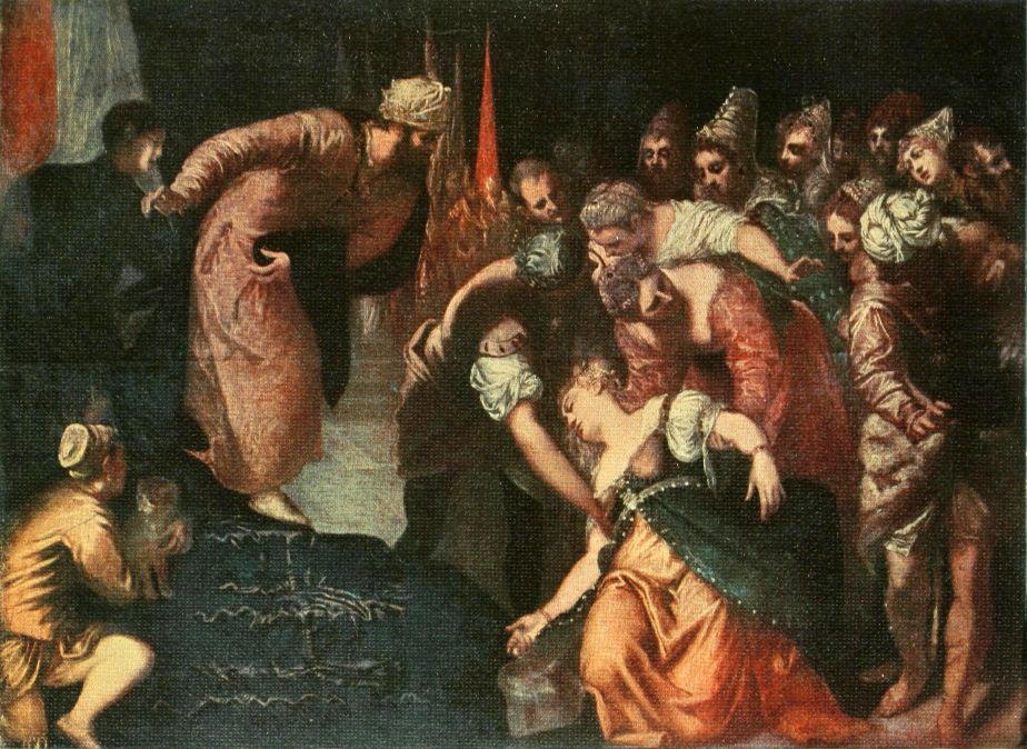 Here we have one of Tintoretto's spirited compositions in which he makes no attempt to adapt his costumes to the period of the Bible story. One and all the figures are sixteenth-century Venetians.