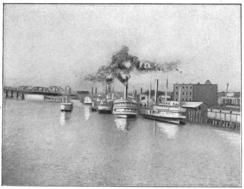 Our journey from Omaha to St. Louis was down the valley of the Missouri, a night’s ride. We crossed the mighty river over an enormously high bridge and then followed the crest of an equally lofty embankment across several miles of wide, rich bottoms to Council Bluffs, in the State of Iowa. “Nobody dares fool with the Missouri,” a man said to me in Omaha, as he pointed out where the voracious river was boldly eating up a wide, black-soiled meadow in spite of the square rods of willow mats and tons of rocks that had been laid down to prevent it. “When the Missouri decides to swallow up a bottom, or a village, or a town, she just does it, there is no escape.” And even the citizens of Omaha do not sleep well of nights when the mighty brown tide fumes too angrily. Hence the extraordinarily high bridge and enormous embankment we traversed when we sought to cross over to dry land in Iowa. The waters of the Missouri are as swift as those of the Yukon, but the river flows for a thousand miles through the soft muds of the Western prairies, instead of through the banks of firm gravel, and it eats its way here and there when and where it chooses, and no man can prevent. Hence the railways, while they traverse the general course of the great valley of the Missouri, do not dare follow too closely the river banks, but they rather keep far away and have just as little to do with the treacherous stream as they may. So it was we did not see much more of the Missouri, but sped into wide, flat, rich stretches of alluvial country until darkness fell upon us and night shut out all suggestions of the river.
