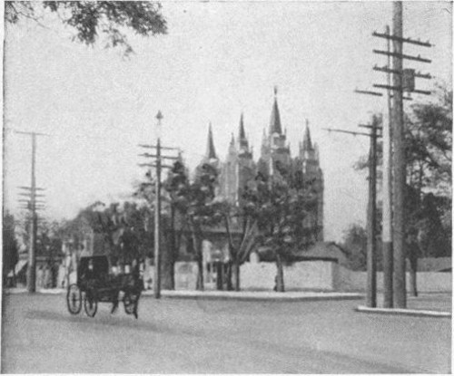 To wander along and through the residence section of the city is also a thing to surprise. Street after street of fine private dwellings, each mansion standing in its own garden, upon its own lawn. Many of them very modern, and many of them far exceeding in cost and imposing elegance any residence Charleston, West Virginia, can yet boast—equal to the most sumptuous homes of Pittsburg and St. Louis—and most of them owned and lived in by cultivated families of the Mormon cult. And how the zeal and faith and religious ardor of this strange sect even now to-day burns in the atmosphere of this their Holy City! It is the same spirit that we met in Holy Moscow, Russia’s sacred capital—but more enlightened, more practical.