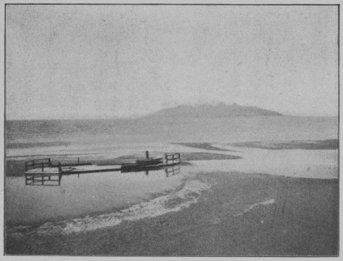 This afternoon we took a little railway and journeyed twelve miles to Saltair, the Atlantic City or Virginia Beach of this metropolis, and there we bathed in the supersaturated brine. I could swim on it, not in it, so buoyant was the water, and my chief difficulty was to keep my head out and my feet in. The lake is sixty miles wide by ninety miles long, with several islands of high, barren hills. A few boats ply on it. No fish can live in it, and the chief use of it is to evaporate its waters for supply of salt. After dipping in it we came out quite encrusted with a white film of intense salt.