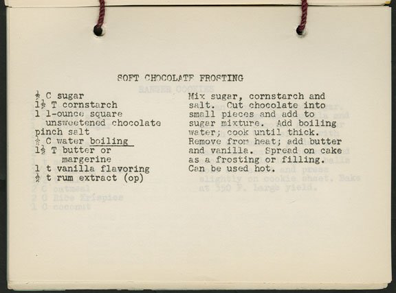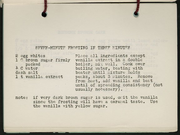 Frosting: Melt chocolate. Mix 1 C sugar, egg, vanilla, milk and butter. Place bowl this mixture in pan of cold water. Add melted chocolate. Beat with rotary beater until stiff. For variation add 2 drops peppermint extract.
