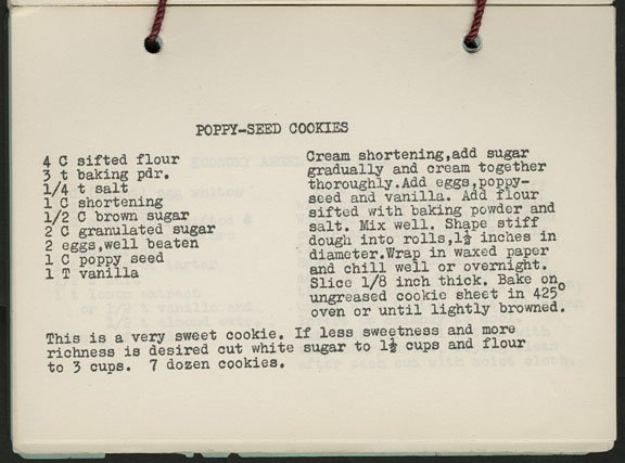 Cream shortening, add sugar gradually and cream together thoroughly. Add eggs, poppy-seed and vanilla. Add flour sifted with baking powder and salt. Mix well. Shape stiff dough into rolls, 1½ inches in diameter. Wrap in waxed paper and chill well or overnight. Slice ⅛ inch thick. Bake on ungreased cookie sheet in 425° oven or until lightly browned.