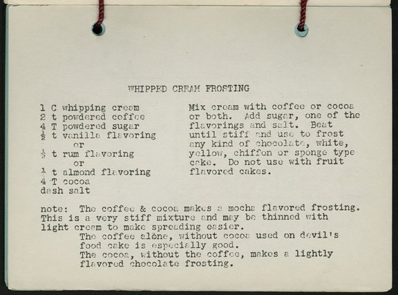 Mix cream with coffee or cocoa or both. Add sugar, one of the flavorings and salt. Beat until stiff and use to frost any kind of chocolate, white, yellow, chiffon or sponge type cake. Do not use with fruit flavored cakes.