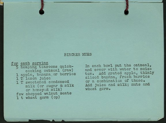 In each bowl put the oatmeal, and cover with water to moisten. Add grated apple, thinly sliced banana, fresh berries or a combination of these. Add juice and milk; nuts and wheat germ.