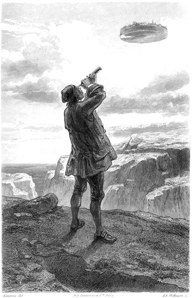 Quand ces gens furent bien assurés que j'étais tranquille, ils cessèrent de me décocher des flèches; mais, par le bruit que j'entendis, je connus que leur nombre augmentait considérablement. En effet, à la distance de deux toises, vis-à-vis mon oreille gauche, j'entendis bruire, une grande heure: on eût dit le bourdonnement d'un grand nombre de travailleurs. Ce fut alors que, tournant un peu la tête de ce côté-là (autant du moins que les chevilles et les cordons me le permettaient), je vis un échafaud, haut de terre d'un pied et demi, où quatre de ces petits bonshommes pouvaient se placer, plus une échelle pour y monter. De ces hauteurs, un d'entre eux, sans doute un grand personnage, me fit une harangue à laquelle je ne compris pas un mot. Avant de commencer, il s'écria trois fois: Langro Dehul san! Ces mots furent répétés ensuite, et commentés par des signes, pour me les faire entendre. Aussitôt cinquante hommes 35 s'avancèrent, ils coupèrent les cordons qui retenaient captif le côté gauche de ma tête, ce qui me donna la liberté de la tourner à droite et d'observer la mine et l'action de l'orateur. Il me parut entre deux âges, et d'une taille au-dessus de la moyenne; un des trois qui l'accompagnaient (sans doute un page) portait la traîne de sa robe, et les deux autres étaient debout, de chaque côté, pour le soutenir. Il me sembla bon orateur, et je conjecturai que, selon les règles de l'art, il mêlait dans son discours des périodes pleines de menaces... et de promesses. Je fis la réponse en peu de mots, c'est-à-dire par un petit nombre de signes, mais d'une manière pleine de soumission, levant ma main gauche et les deux yeux au soleil, pour le prendre à témoin que je mourais de faim, n'ayant rien mangé depuis longtemps.