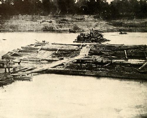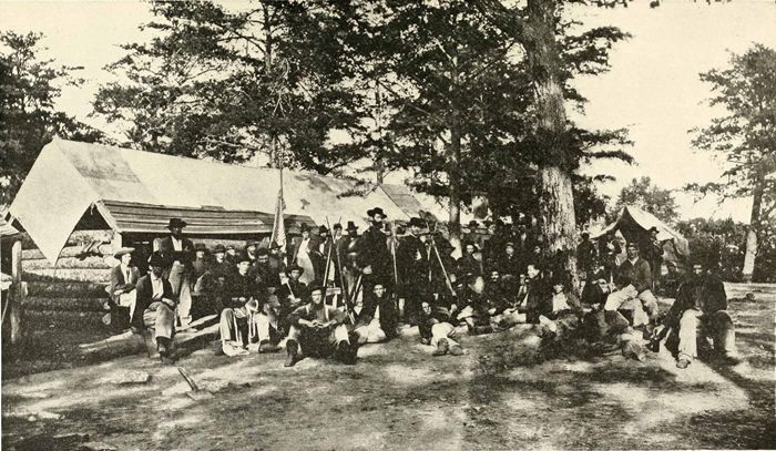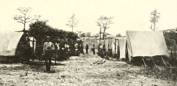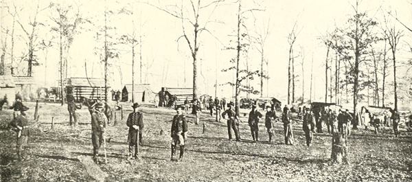 When Thomas began to draw together his forces to meet Hood at Nashville, he ordered the garrison at Johnsonville, on the Tennessee, eighty miles due west of Nashville, to leave that place and hasten north. It was the garrison at this same Johnsonville that, a month earlier, had been frightened into panic and flight when the bold Confederate raider, Forrest, appeared on the west bank of the river and began a noisy cannonade. New troops had been sent to the post. They appear well coated and equipped. The day after the photograph was taken (November 23d) the encampment in the picture was broken.