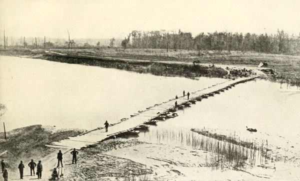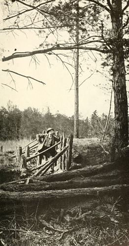 These well-made protections of sharpened spikes, as formidable as the pointed spears of a Roman legion, are chevaux-de-frise of the Confederates before their main works at Petersburg. They were built after European models, the same as employed in the Napoleonic wars, and were used by both besiegers and besieged along the lines south of the Appomattox. Those shown in this picture were in front of the entrenchments near Elliott’s salient and show how effectually it was protected from any attempt to storm the works by rushing tactics on the part of the Federal infantry. Not far from here lies the excavation of the Crater.