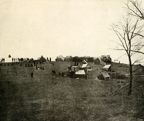 Camp-fires were still smouldering along the side of the abatis where the lens caught the field of Nashville, while Thomas’ concentric forward movement was in progress. Note the abatis to the right of the picture, the wagons moving and ready to move in the background, and the artillery on the left. White tents gleam from the distant hills. A few straggling soldiers remain. The Federals are closing with Hood’s army a couple of miles to the right of the scene in the picture.