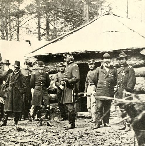 No photographer was present at Appomattox, that supreme moment in our national history, when Americans met for the last time as foes on the field. Nothing but fanciful sketches exist of the scene inside the McLean home. But here is a photograph that shows most of the Union officers present at the conference. Nine of the twelve men standing above stood also at the signing of Lee’s surrender, a few days later. The scene is City Point, in March, 1865. Grant is surrounded by a group of the officers who had served him so faithfully. At the surrender, it was Colonel T. S. Bowers (third from left) upon whom Grant called to make a copy of the terms of surrender in ink. Colonel E. S. Parker, the full-blooded Indian on Grant’s staff, an excellent penman, wrote out the final copy. Nineteen years later, General Horace Porter recorded with pride that he loaned General Lee a pencil to make a correction in the terms. Colonels William Duff and J. D. Webster, and General M. R. Patrick, are the three men who were not present at the interview. All of the remaining officers were formally presented to Lee. General Seth Williams had been Lee’s adjutant when the latter was superintendent at West Point some years before the war. In the lower photograph General Grant stands between General Rawlins and Colonel Bowers. The veins standing out on the back of his hand are plainly visible. No one but he could have told how calmly the blood coursed through them during the four tremendous years.