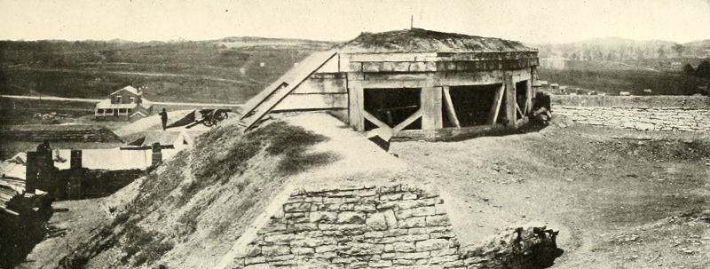 It was Hood’s hope that, when he had advanced his line to the left of the position shown in this photograph, he might catch a weak spot in Thomas’ forces. But Thomas had no weak spots. From the casemate, armored with railroad iron, shown here, the hills might be easily seen on which the Confederate center and left were posted at the opening of the great battle of Nashville.