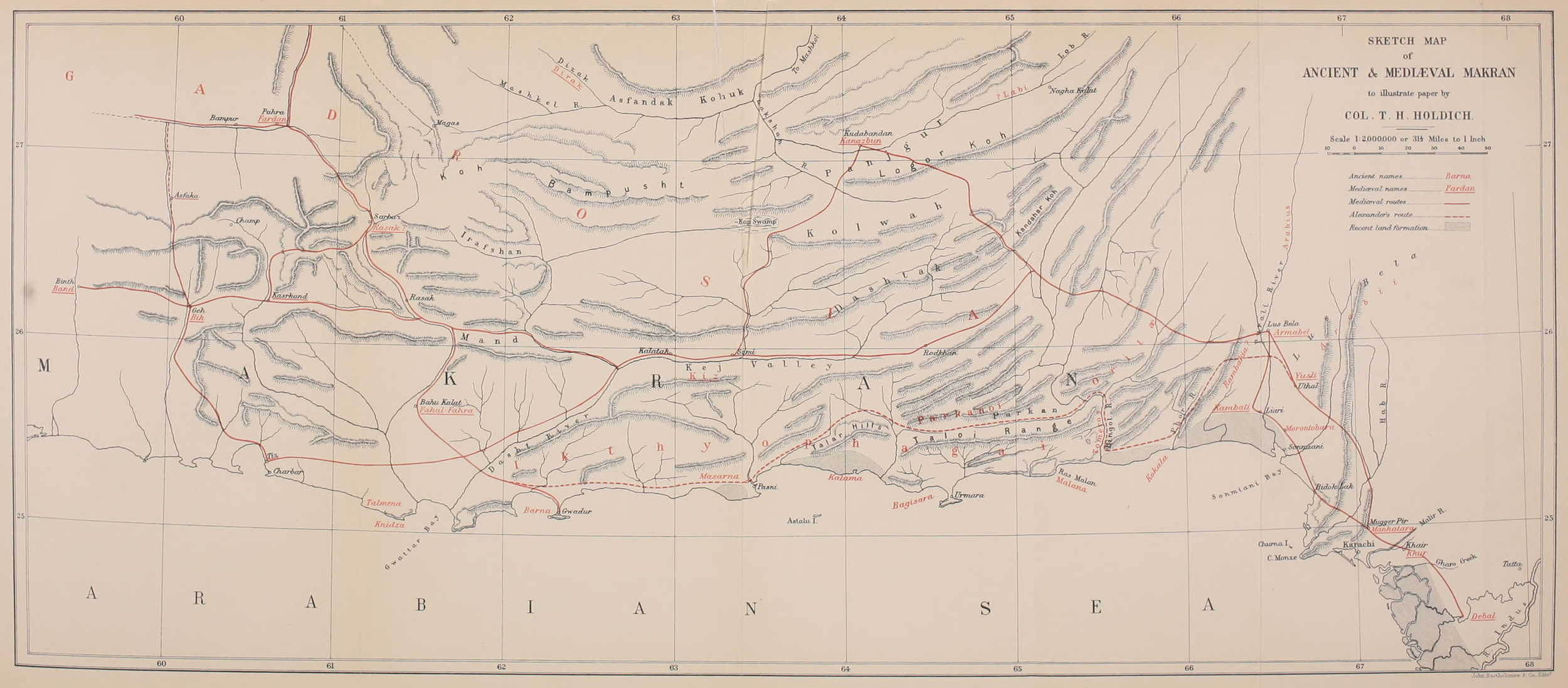 Thus Afghanistan and Baluchistan, the countries with which we are more immediately concerned, were probably far better known to Assyrian and Persian kings than they were to the British Intelligence Office (or its equivalent) of a century ago. The first landward explorations of these countries are lost in pre-historic mists, but we find that the first scientific mission of which we have any record (that which was led by Alexander the Great) was well supplied with fairly accurate geographical information regarding the main route to be followed and the main objectives to be gained.