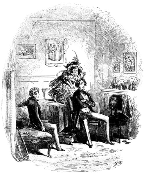 Traddles’s house is one of the very houses—or it easily may have been—which he and Sophy used to parcel out, in their evening walks. It is a large house; but Traddles keeps his papers in his dressing-room, and his boots with his papers; and he and Sophy squeeze themselves into upper rooms, reserving the best bed-rooms for the Beauty and the girls. There is no room to spare in the house; for more of “the girls” are here, and always are here, by some accident or other, than I know how to count. Here, when we go in, is a crowd of them, running down to the door, and handing Traddles about to be kissed, until he is out of breath. Here, established in perpetuity, is the poor Beauty, a widow with a little girl; here, at dinner on Sophy’s birthday, are the three married girls with their three husbands, and one of the husband’s brothers, and another husband’s cousin, and another husband’s sister, who appears to me to be engaged to the cousin. Traddles, exactly the same simple, unaffected fellow as he ever was, sits at the foot of the large table like a Patriarch; and Sophy beams upon him, from the head, across a cheerful space that is certainly not glittering with Britannia metal.