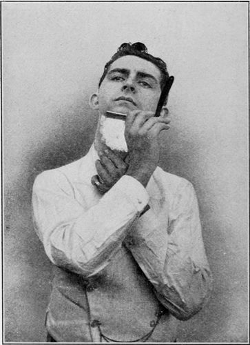 Place the fingers of the left hand in front of and just above the ear and press upward so as to draw the skin smooth on the upper left cheek. With the razor in the right hand, toe pointing upward, reach across the face as shown above, and shave downward. In shaving the lower part of the cheek and chin, follow downward with the left hand, keeping the skin tightly drawn.