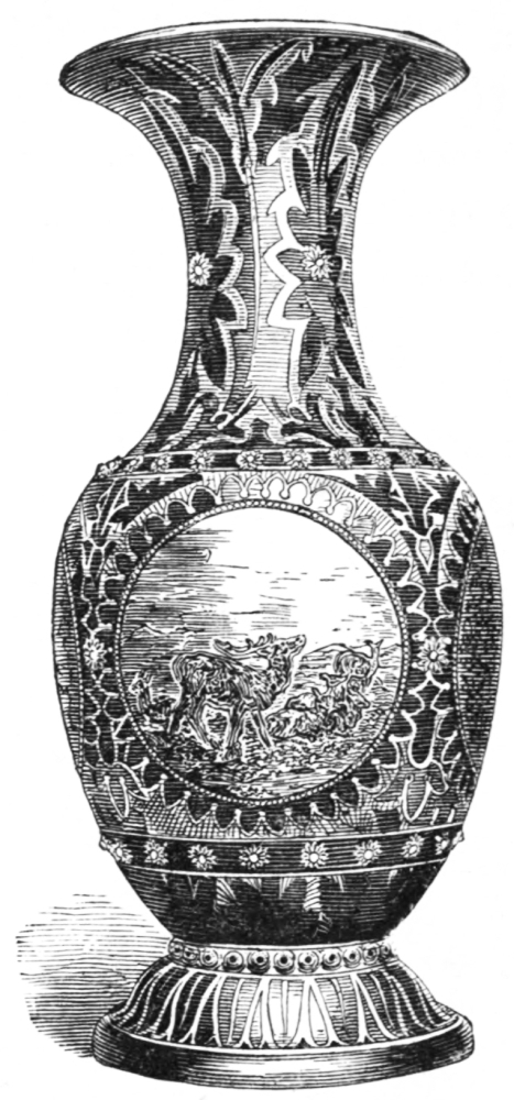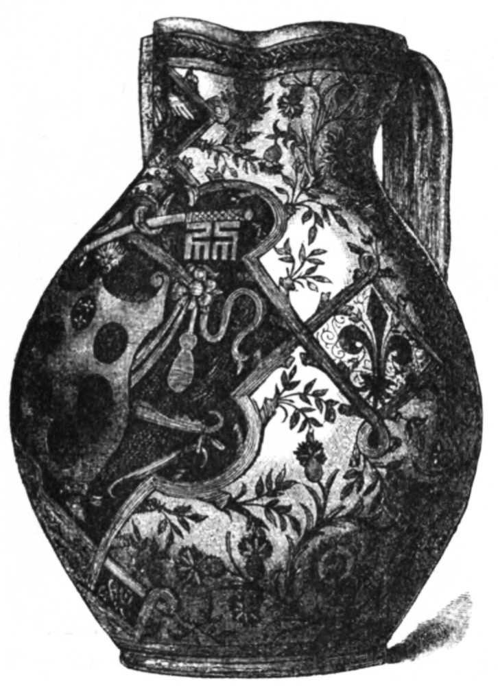 In regard to the engravings, while it was, of course, found necessary in many cases to cull from the rich accumulations of ceramic treasures in Europe, in order to secure the proper illustration of the work, the preference has invariably been given to the collections of America. Such a course recommended itself for obvious reasons. It was thought that it would, in the first place, gratify those desirous of knowing where, in this country, the best representatives of the art of certain countries are to be found; and that, in the second place, it would direct artists where to study the best styles of decoration. One result of the author’s investigations in this matter has been the conviction that the American collector is cosmopolitan in his tastes, and that the American cabinet—in many instances the American tea-table—represents the amity of nations. The arts of all countries are found arrayed side by side in a profusion of which it would have been hard, a few years ago, to find a trace.