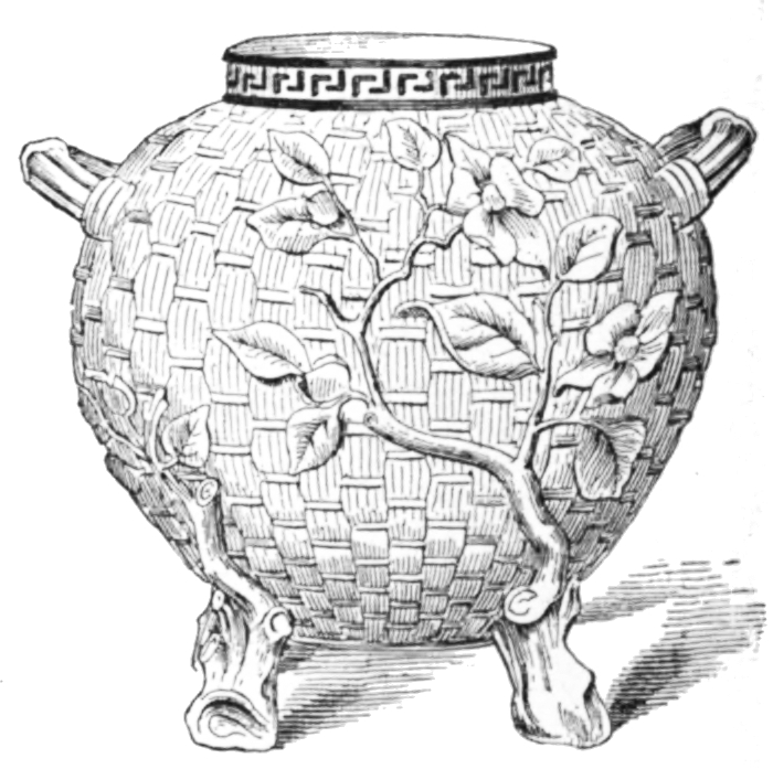 Continuity of History.—Early British Urns.—Scottish Relics.—Irish Urns.—Roman Conquest.—Caistor Ware.—Anglo-Roman Ware.—Saxon Period.—After the Norman Conquest.—Tiles.—Dutch Potteries in England.—English Delft.—Stone-ware.—Sandwich.—Staffordshire Potteries.—Early Products.—The Tofts.—Salt Glaze.—Broadwell and the Elers Family.—Use of Calcined Flint.—Wedgwood.—His Life.—Jasper Ware.—Queen’s Ware.—The Portland Vase.—Basaltes.—Wedgwood’s Removal to Etruria.—His Death.—Minton & Co.—Their Imitations of the Oriental.—Pate Changeante.—Pate-sur-Pate.—Cloisonné Enamel on Porcelain.—Other Reproductions.—Their Majolica.—Their Artists.—Minton, Hollins & Co.—Lambeth.—Doulton Ware.—Terra-cotta and Stone-ware.—George Tinworth.—Fulham.—Bristol.—Leeds.—Liverpool.—Lowestoft.—Yarmouth.—Nottingham.—Shropshire.—Yorkshire.—Porcelain: Plymouth Hard Porcelain.—Cookworthy.—Bow.—Chelsea.—Derby.—Worcester.—Minton.—Pate-sur-Pate.—Spode.—Copeland.—Bristol.—Tunstall.—Caughley.—Nantgarrow.—Swansea.—Colebrookdale.—Pinxton.—Shelton.—Belleek.—General Character of Manufacture in Great Britain |