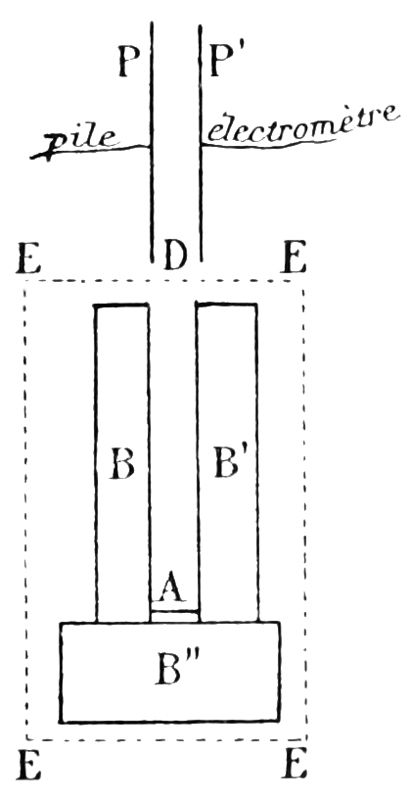 Mesure de l'intensité du rayonnement.—La méthode employée consiste à mesurer la conductibilité acquise par l'air sous l'action des substances radioactives; cette méthode a l'avantage d'être rapide et de fournir des nombres qu'on peut comparer entre eux. L'appareil que j'ai employé à cet effet se compose essentiellement d'un condensateur à plateaux AB (fig. 1). La substance active finement pulvérisée est étalée sur le plateau B; elle rend conducteur l'air entre les plateaux. Pour mesurer cette conductibilité, on porte le plateau B à un potentiel élevé, en le reliant à l'un des pôles d'une batterie de petits accumulateurs P, dont l'autre pôle est à la terre. Le plateau A étant maintenu au potentiel du sol par le fil CD, un courant électrique s'établit entre les deux plateaux. Le potentiel du plateau A est indiqué par un électromètre E. Si l'on interrompt en C la communication avec le sol, le plateau A se charge, et cette charge fait dévier l'électromètre. La 9 vitesse de la déviation est proportionnelle à l'intensité du courant et peut servir à la mesurer.