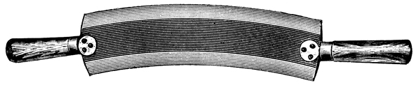 If done by hand, the skins are placed on a sloping glass or slate table, with the flesh side uppermost, which is then stretched out by strong pressure with a tool known as a sleeker, the strokes being made downward in the direction of the hair growth. The flesh side done, the whole skin is turned over and the grain side is similarly treated. Sometimes only the flesh side is struck out, especially if the grain is soft and tender. The sleeker consists of an iron, steel, or copper blade, about 6 in. square, fitted in a wood handle (Fig. 32). The skins are hung up in the drying-room immediately 142 they are extended and smoothed by sleeking, and are then either allowed to dry completely, or, as is generally the case with best leather, they are hung up until a great deal of the moisture is evaporated and the skins are left in a slightly moist, or, as it is generally termed, "sammed" condition. The skins are then taken down, damped in dry parts, folded over, laid in piles to equalise the moisture, and finally smoothed out and stretched again by hand or machine. This second operation after the dyeing is known as "setting."