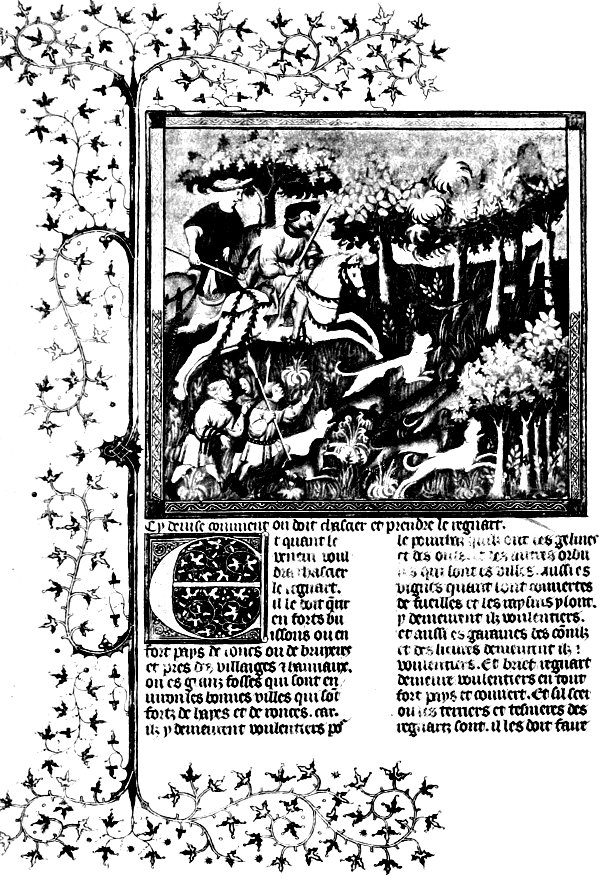 It seemed very desirable to elucidate the textual description of hunting by the reproduction of good contemporary illuminations, but unfortunately English art had not at that period reached the high state of perfection which French art had attained. As a matter of fact, only two of the nineteen English MSS. contain these pictorial aids, and they are of very inferior artistic merit. The French MSS. of La Chasse, on the other hand, are in several cases exquisitely illuminated, and MS. f. fr. 616, which is the copy from which our reproductions—much reduced in size, alas!—are made, is not only the best of them, but is one of the most precious treasures of the Bibliothèque Nationale in Paris. These superb miniatures are unquestionably some of the finest handiwork of French miniaturists at a period when they occupied the first rank in the world of art.