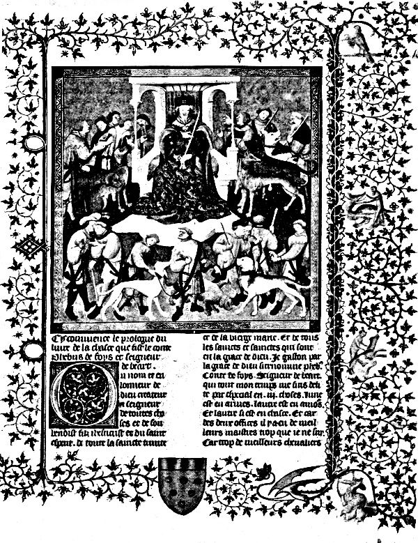 Let it at once be said that the greater part of the book before us is not the original work of Edward of York, but a careful and almost literal translation from what is indisputably the most famous hunting book of all times, i.e. Count Gaston de Foix's Livre de Chasse, or, as author and book are often called, Gaston Phœbus, so named because the author, who was a kinsman of the Plantagenets, and who reigned over two principalities in southern France and northern Spain, was renowned for his manly beauty and golden hair. It is he of whom Froissart has to tell us so much that is quaint and interesting in his inimitable chronicle. La Chasse, as Gaston de Foix tells us in his preface, was commenced on May 1, 1387, and as he came to his end on a bear hunt not much more than four years later, it is very likely that his youthful Plantagenet kinsman, our author, often met him during his prolonged residence in Aquitaine, of which, later on, he became the Governor.