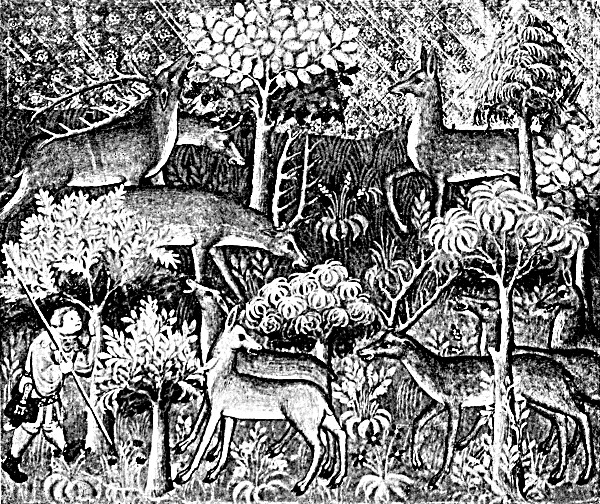 The hart is a common beast enough and therefore me needeth not to tell of his making, for there be few folk that have not seen some. The harts be the lightest (swiftest) beasts and strongest, and of marvellous great cunning. They are in their love, which men call rut, about the time of the Holy Rood28 in September and remain in their hot love a whole month and ere they be fully out thereof they abide (in rut) nigh two months. And then they are bold, and run upon men as a wild boar would do if he were hunted. And they be wonderfully perilous beasts, for with great pain shall a man recover that is hurt by a hart, and therefore men say in old saws: "after the boar the leech and after the hart the bier." For he smiteth as the stroke of the springole,29 for he has great strength in the head and the body. They slay, fight and hurt each other, when they be in rut, that is to say in their love, and they sing in [Pg 24] their language that in England hunters call bellowing as man that loveth paramour.30 They slay hounds and horses and men at that time and turn to the abbay (be at bay) as a boar does especially when they be weary. And yet have men seen at the parting of their ligging (as they start from the lair)31 that he hath hurt him that followeth after, and also the greyhounds32 and furthermore a courser. And yet when they are in rut, which is to say their love, in a forest where there be few hinds and many harts or male deer, they slay, hurt and fight with each other, for each would be master of the hinds. And commonly the greatest hart and the most strong holdeth the rut and is master thereof. And when he is well pured and hath been long at rut all the other harts that he hath chased and flemed away (put to flight) from the rut then run upon him and slay him, and that is sooth. And in parks this may be proved, for there is never a season but the greatest hart will be slain by the others not while he is at the rut, but when he has withdrawn and is poor of love. In the woods they do not so often slay each other as they do in [Pg 25] the plain country. And also there are divers ruts in the forest, but in the parks there are none but that are within the park.33 After that they be withdrawn from the hinds they go in herds and in soppes (troops) with the rascal (young lean deer) and abide in (waste) lands and in heathes more than they do in woods, for to enjoy the heat of the sun, they be poor and lean for the travail they have had with the hinds, and for the winter, and the little meat that they find. After that they leave the rascal and gather together with two or three or four harts in soppes till the month of March when they mew (shed) their horns, and commonly some sooner than others, if they be old deer, and some later if they be young deer, or that they have had a hard winter, or that they have been hunted, or that they have been sick, for then they mew their heads and later come to good points. And when they have mewed their heads they take to the strong (thick) bushes as privily as they may, till their heads be grown again, and they come into grease; after that they seek good country for meating (feeding) [Pg 26] of corn, of apples, of vines, of tender growing trees, of peas, of beans, and other fruits and grasses whereby they live. And sometimes a great hart hath another fellow that is called his squire, for he is with him and doth as he will. And so they will abide all that season if they be not hindered until the last end of August. And then they begin to look, and to think and to bolne and to bellow and to stir from the haunt in which they have (been) all the season, for to go seek the hinds. They recover their horns and are summed of their tines as many as they shall have all the year between March when they mewed them to the middle of June; and then be they recovered of their new hair that men call polished and their horns be recovered with a soft hair that hunters call velvet at the beginning, and under that skin and that hair the horn waxes hard and sharp, and about Mary Magdalene day (July 22) they fray their horns against the trees, and have (rubbed) away that skin from their horns and then wax they hard and strong, and then they go to burnish and make them sharp in the colliers places (charcoal pits) that men make sometimes in the great groves. And if they can find none they go against the corners of rocks or to crabbe tree or to hawthorn or other trees.34 [Pg 27]