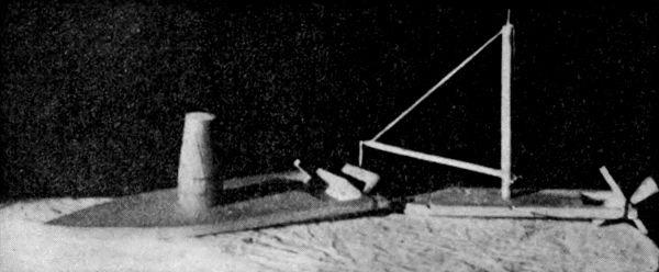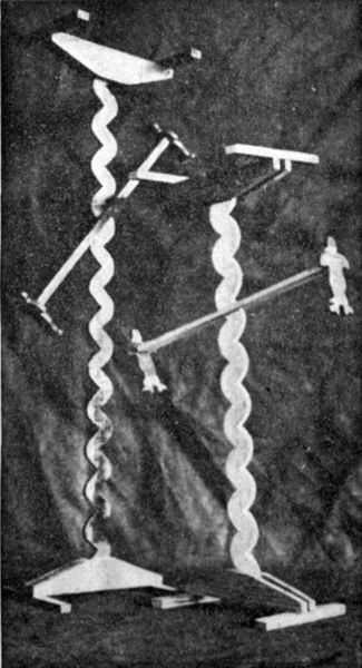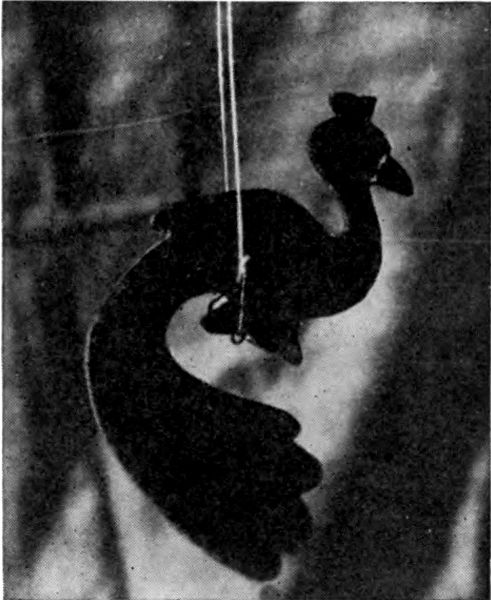 The body, platform and wheels (Fig. 17) are of 1/4" stock. The wings are a little thinner. Saw out one body and two wings and bore holes for cords, as shown in the drawing. Saw out the platform and four wheels, and finish them carefully. The front wheels turn on 1" flat-headed nails that are driven into the edge of the platform 3/4" from the end. The rear wheels are driven onto a wire axle which turns in two wire staples that are driven into the bottom of the platform, 3/4" from the end and 1/4" from each edge. In driving these staples, take thought to avoid splitting the platform. Also, when boring holes thru the center of the four wheels, take care to secure proper direction and sizes of holes for a running fit in the front wheels and a press fit onto the axle in the rear wheels. Hold the body with foot up, and nail the platform onto it. With round-nose pliers make the connecting rods from No. 12 wire with the eyes neatly shaped and at right angles to each other. Attach the rods to the wings by staples so the joints will work freely without too much play. Attach the other ends of the rods to the outer faces of the rear wheels by means of short flat-headed nails. The nails pass thru the eyes of the rods and are driven into the wheels 1/4" from the outer rims. The nails in the two wheels must be in line with each other, as they act as cranks to actuate the wings. After the rear axle is assembled and fastened in place, the wings are fastened to the body.