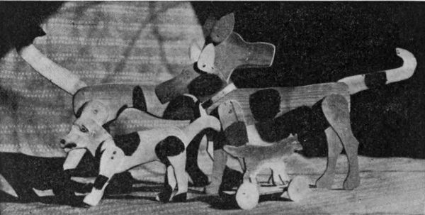 A collection of full-size toy patterns. Toys which make a strong appeal to the child. Each pattern sheet presents a particular class of toys including Jointed Animals, Animal Rocker Toys, Wheeled Platform Toys, Lever Toys, String Toys, Freak Toys, Novelties, etc. While intended to be worked out in wood many are equally well adapted for cardboard. Toy-making at home from these patterns is a fine hobby for the boy from six to twelve years of age, and in the school is a fascinating manual training activity. These patterns are based upon the author's long experience in the teaching of toy-making in public and private schools and summer camps. They are well presented on sheets size 10-1/2 x 14 inches and are enclosed in a portfolio with an attractive design in color. Price, 80 cents.