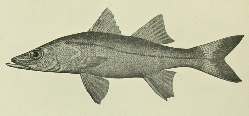 The snook is a good game-fish, strong and active, rises to the fly in shallow water, and will take any kind of fish or crab bait, or the trolling-spoon. It is shaped somewhat like the pike-perch, with the flattened head and jaws of the pike minus its sharp teeth. It is attired in a silvery mantle with a broad, black stripe running along the side from head to tail. It is a fair food-fish if skinned instead of scaled. It is known as snook on the east coast, and as rovallia on the west coast, a corruption of its Cuban name, robalo. It grows to two or three feet and twenty to thirty pounds. Heavy[158] black bass, or light striped bass, tackle is necessary to withstand its fierce rushes when hooked.