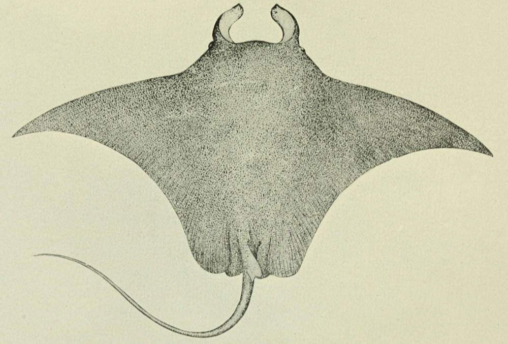 The largest barracuda we captured measured six and one-half feet, the largest tarpon seven and one-quarter, an immense sawfish nineteen, and a man-eating shark fifteen feet. But the liveliest tussle we had was with a devil-fish of moderate dimensions, [165]eight feet across the pectoral fins—I have seen them of twenty. Following the lead of Victor Hugo, the octopus is often called "devil-fish," but the name rightly belongs to this fish, the largest of the rays (Manta birostris).