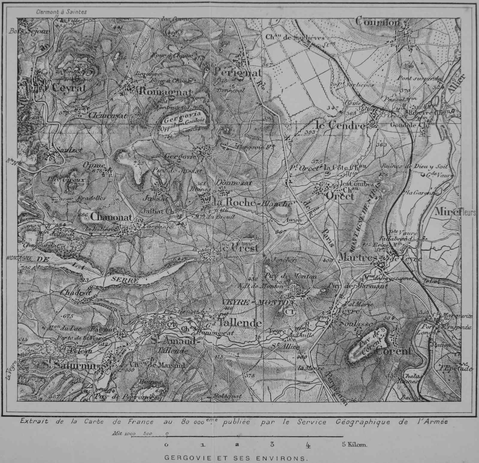 [68] Je parle du très ancien village de Merdogne, Gergovie depuis 1862 (l’appellation primitive est tombée en désuétude). Le principal domaine, sinon le seul, qu’ait porté la montagne, celui qui s’est appelé, peut-être dès les plus anciens temps du Moyen Age, Gergovia, Gergoieta(?), ou Gergoviat (orthographe du cadastre de 1816), est également situé au Sud.