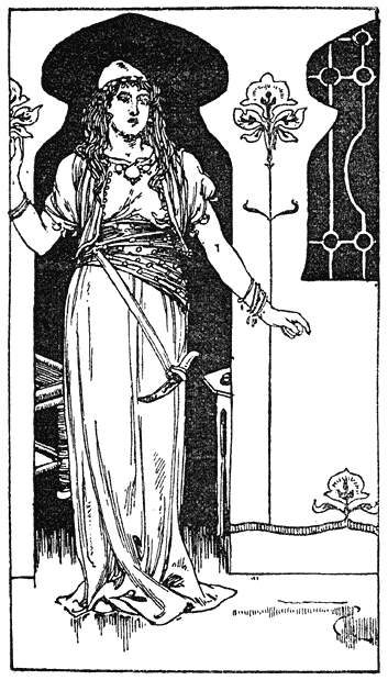 Morgiane echter, had het voornemen van den valschen Chogia Hoesein doorzien, en liet hem geen tijd zijn boosaardig plan uit te voeren. Inplaats van te gaan avondmalen, trok zij een bekoorlijk danscostuum aan, [87]koos er een passenden haartooi bij uit, deed een gordel van verguld zilver om, en bevestigde daaraan een dolk, welks scheede en gevest van hetzelfde metaal waren; voor haar gezicht hing zij een zeer schoon masker. Nadat zij zich aldus verkleed had, zeide zij tot Abdallah: „Abdallah, neem je tamboerijn en laat ons naar binnen gaan, om voor den gast van onzen meester, den vriend van zijn zoon, de vroolijke dansen uit te voeren, die wij menigmaal des avonds voor hem ten beste geven.” Abdallah nam de tamboerijn, ging, daarop spelend, voor Morgiane uit en trad zoo in de zaal. Achter hem kwam Morgiane, die op een hoogst ongedwongen en bevallige wijze diep boog, net als had zij de toestemming, hare kunsten te vertoonen. Daar Abdallah zag, dat Ali Baba wilde spreken, hield hij op met trommelen.