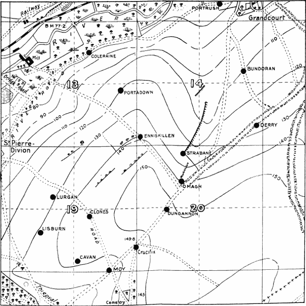 The day after we landed was an easy one. No orders came as to moving, and the time was spent by our men in parading about the camp, sleeping, and talking to the numerous women and small boys who wandered round the railings, clamouring for “biscuit,” “penny,” or “bully beef.” So urgent was the appeal for these commodities, that the men took it for granted that the entire population of France was starving, and handed over that somewhat elusive “unconsumed portion” of the previous day’s ration, or any that remained of it. As the day wore on and word was received that there would be no move until the following morning, some of the officers were allowed into town in the afternoon. Boulogne in war-time is not an interesting place, and an hour was sufficient for exploration purposes. With the exception of a few French territorials, guarding the bridges and railway station, the town seemed to be entirely handed over to the British, whose motor ambulances glided in every direction. The “Cambria,” with her green and white topsides and large Red Cross flag at her masthead, lay alongside at the quay, a sight to make one home-sick, which brought one’s mind back to Dublin Bay and Kingstown Harbour in the days of peace. It rained off and on all day, and was bitterly cold, an early foretaste of the bitter winds we were to experience in France. We fell in next morning, Wednesday, 6th October, at 10-15, and marched to the Central station, where we entrained. Speculation was rife as to where we were going, whether Belgium, which savoured of Ypres and all that that name implied, or[Pg 11] the new line between Arras and the Somme. The latter was a sector taken over by the British from the French in the July preceding, and had the name of being quiet and pleasant compared to the more northerly parts of the line. As the day wore on and we steamed South through Abbeville, and finally came to Amiens, there was no doubt as to our destination. From Amiens we moved on to a side line, and at 6-15 came to Flesselles, a small town about 15 miles south of Amiens, where we detrained. It was a lovely autumn evening, and with a slight breeze blowing from the East, and as we stood fallen in ready to move off from the station, we heard the low rumble and occasional growl of a big gun. From Flesselles we had to march some twelve kilometres to Rubenpre, which was to be our billeting town. Very heavily laden as we all were, officers and men, again the mistake was made of setting too fast a pace. It was an exceptionally warm evening, the men were tired, hungry and thirsty, after the long train journey, and as an hour, and then two, passed by, and we still appeared to be some distance from our town, the softer hearts in the battalion collapsed. There is no necessity to dwell on the unpleasant memories of our first route march in France; it was the most trying experience for both officers and men that we had for many a long day. As we marched East, and as the night grew darker, the flares, and the lurid flashes of gunfire became more vivid, and helped to keep up the interest of the men and distract their attention from the general weariness; at any rate we were, after eleven months’ training, getting to the “Front” at last.