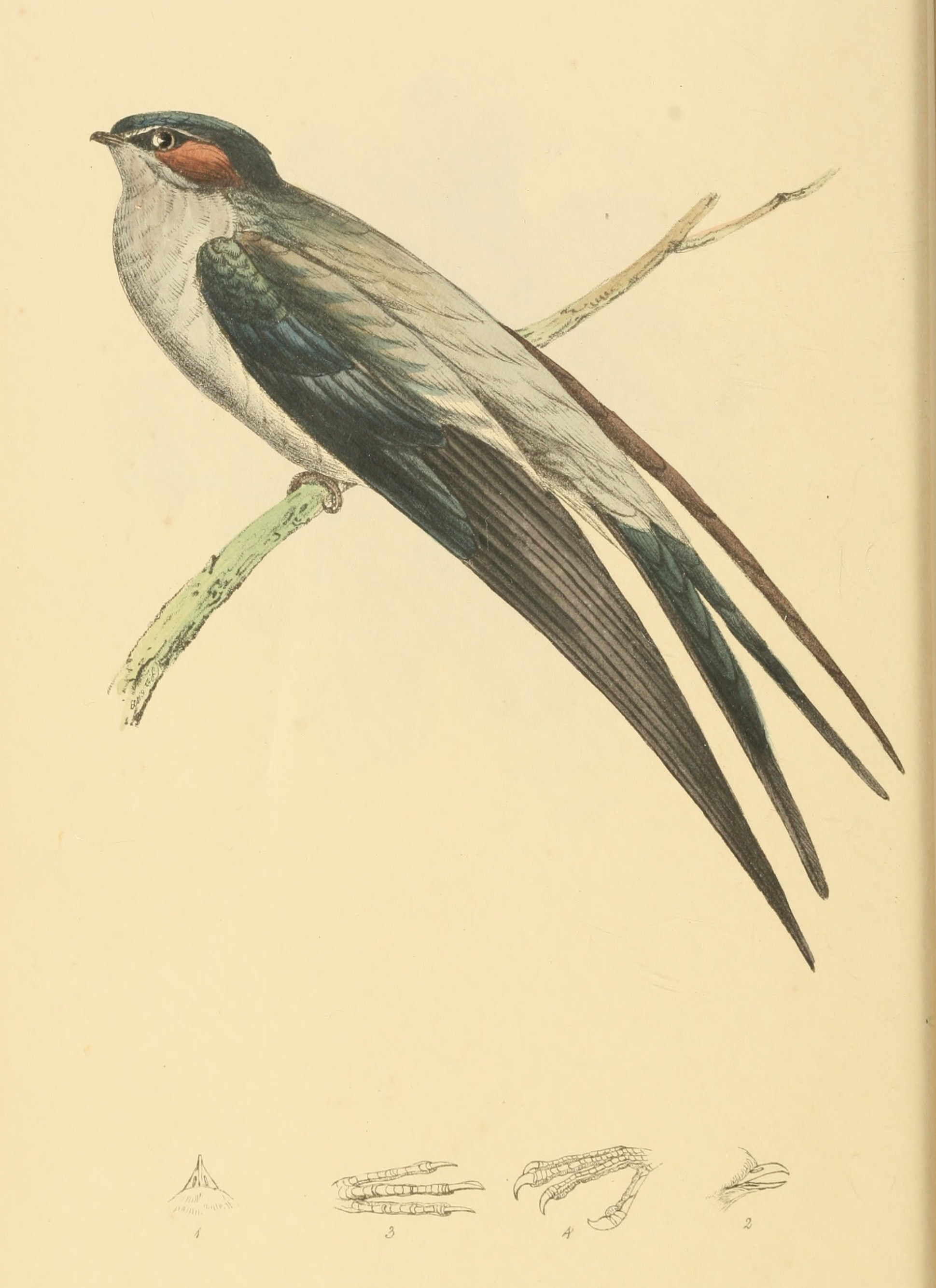 To Dr. Horsfield, one of the most successful and scientific investigators of Oriental Zoology, we are indebted for the first discovery, in Java, of this charming bird. Of its economy nothing is as yet known; but the uncommon length of its wings, indicate its possessing the utmost rapidity of flight. Another, and a much larger species, is among the Ornithological treasures discovered in the Eastern Archipelago by my estimable friend M. Lesson, and which he has already communicated to the public. A third is the Cypselus Comatus, of M. M. Temminck and Laugier.