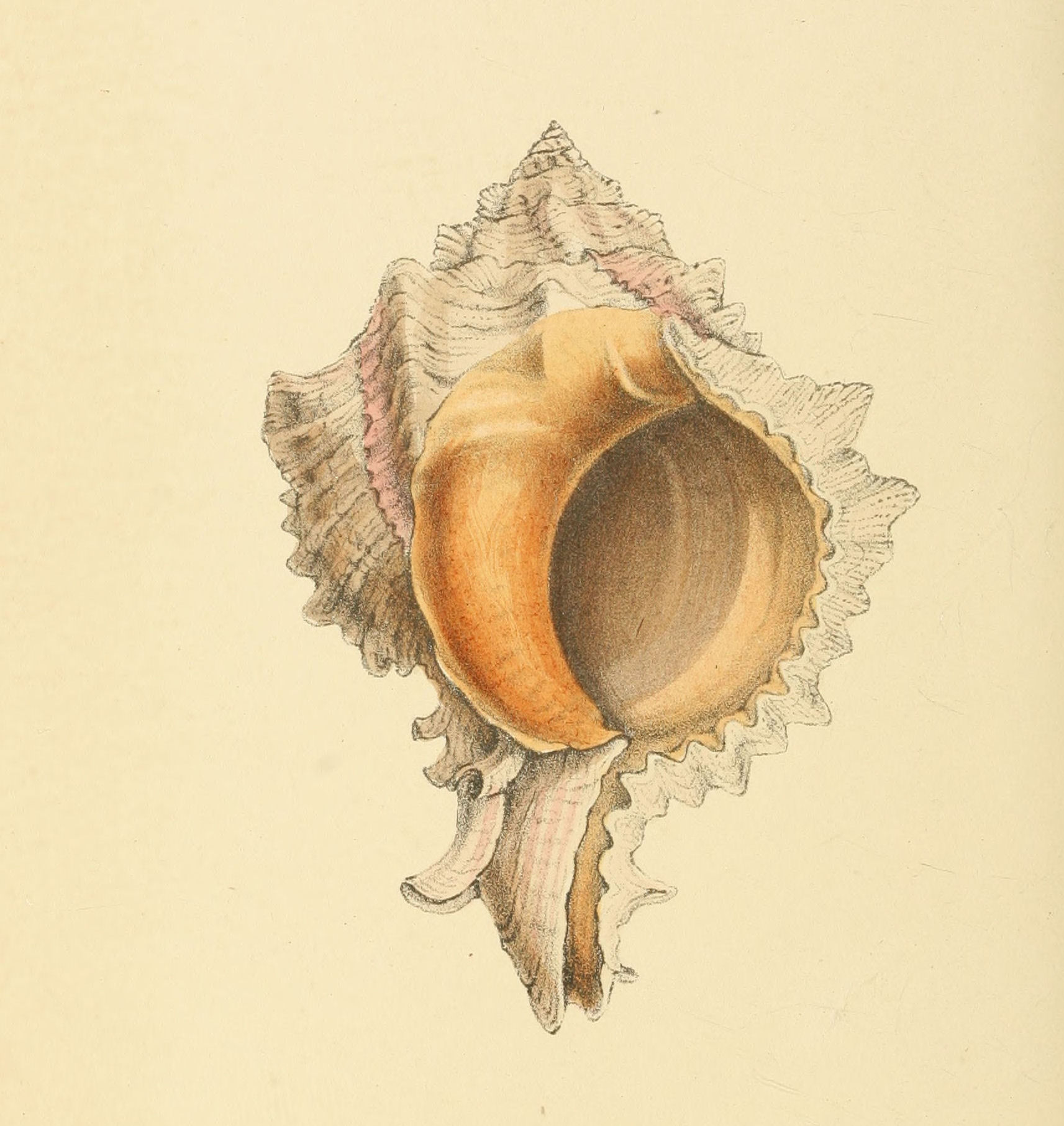 Ti. (Ty. 5) Shell slender, fawn coloured, unspotted, marked by slender crowded, transverse, convex ribs, the interstices deeply cancellated; inner lip wanting, outer lip crenately undulate; pillar 5 plaited.