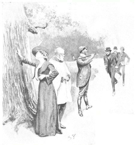 A quarter of an hour passed and then a second cyclist appeared. This time it was the young lady coming from the station. I saw her look about her as she came to the Charlington hedge. An instant later the man emerged from his hiding-place, sprang upon his cycle, and followed her. In all the broad landscape those were the only moving figures, the graceful girl sitting very straight upon her machine, and the man behind her bending low over his handle-bar, with a curiously furtive suggestion in every movement. She looked back at him and slowed her pace. He slowed also. She stopped. He at once stopped too, keeping two hundred yards behind her. Her next movement was as unexpected as it was spirited. She suddenly whisked her wheels round and dashed straight at him! He was as quick as she, however, and darted off in desperate flight. Presently she came back up the road again, her head haughtily in the air, not deigning to take any further notice of her silent attendant. He had turned also, and still kept his distance until the curve of the road hid them from my sight.