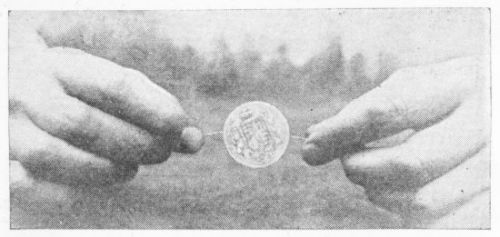 "I send you a photograph showing in two positions the curious amalgamation of coins by a flash of lightning. This incident occurred in a miner's hut in Swazieland some time in December, 1897, and the photograph represents money to the value of fourteen shillings and sixpence, viz., one half sovereign, four single shillings, and a sixpence. The money was placed on a table in the order given, the half-sovereign being under the other coins and lying on the face of the table. The hut was not injured by the lightning, as the fluid entered by the window and passed over the table (on which the coins were) and out at the open door. The table (in the centre of the hut and in a line with the window and door) had a badly scorched line over it. The money, after the flash, lay in exactly the same position as before; the only difference was its being fused into one mass instead of six different coins. At the time of the flash the miner happened to be absent."—Mr. A. E. Graham Lawrance, Barberton, Transvaal.
