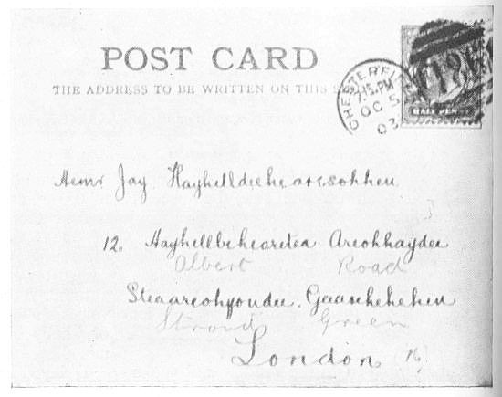 "I send you a post-card which I received in the ordinary way by post from my brother, who lives at Sutton Scarsdale, a scattered village near Chesterfield. You will notice that the card was posted at 7.15 p.m. on the 5th October, and it was delivered during the evening of the following day. The address looks a mixture of Greek and German, but on inspection it will be found that each letter is spelled out in full. The pencilled words were inserted by the Post Office officials. The Post Office is often the object of complaints for tardiness in delivery, but I think great credit is due to it for its cleverness and promptness in this case."—Mr. John Alderson, 12, Albert Road, Stroud Green, N.