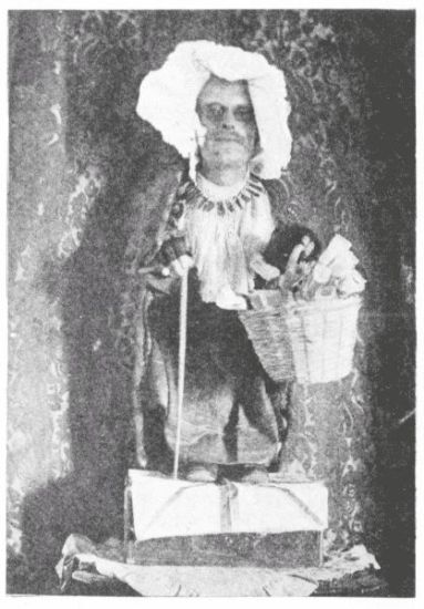 "This figure of the dwarf, taken at an evening party in Kimberley, South Africa, was impersonated by my brother and a friend as follows: My brother stood upright with his hands on a table (these forming the feet of the dwarf), on which were placed stockings and small shoes. He had a little garment made with sleeves, through which his friend, who stood just behind, put his arms and hands, on which were mittens to make them look small; these formed the hands of the dwarf. My brother was adorned with a large sun hat called a 'cappie,' goggles, and a necklace, and the dwarf was complete—his friend, of course, being concealed by curtains."—Mr. F. E. Glover, 41, Drayton Park, Highbury, N.