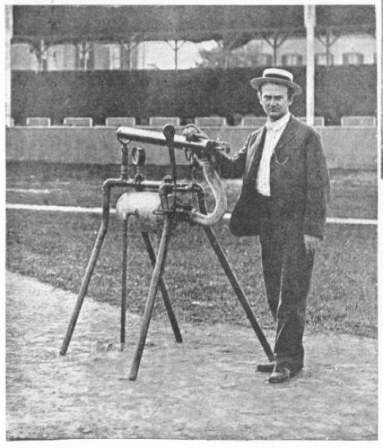 "This curious-looking machine is a baseball pitcher which is automatic. It is operated by compressed air, and is so arranged that it will 'pitch' a ball with an upward curve or downward curve just as well as an expert ball player. The machine consists of a tube about thirty-six inches long which is just large enough to hold the ball. The tube can be pointed in any direction, and the rear end is fitted with a contrivance by which the ball can be curved. When the operator wishes to make a pitch he merely presses a lever which admits the compressed air into the tube, and the ball is shot out like the bullet from an air-gun. The invention is not intended to take the place of a human pitcher, but to be used in practice games, so that the man at the bat can become expert in hitting curves and balls pitched at various degrees of speed." Why should not a similar machine be used in this country as a practice bowler at cricket?—The above is sent by Mr. D. Allen Willey, Baltimore.