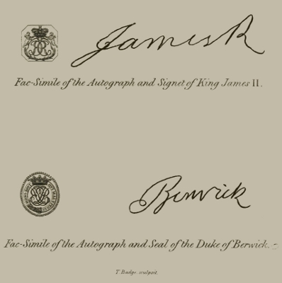 ☛ The Book-binder will take care to place the Engraving, which presents fac-similes of the hand-writing and seals of King James II. and the Duke of Berwick, at the opposite page.