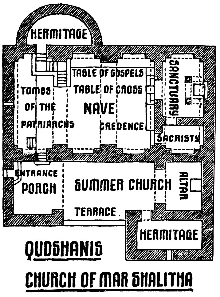 [132] Attached to the church are a couple of anchorites’ cells, and within the last twenty-five years one of these was actually inhabited by a venerable hermit—the rabban Yonan. The incumbent is entitled to reside there still—if he likes.