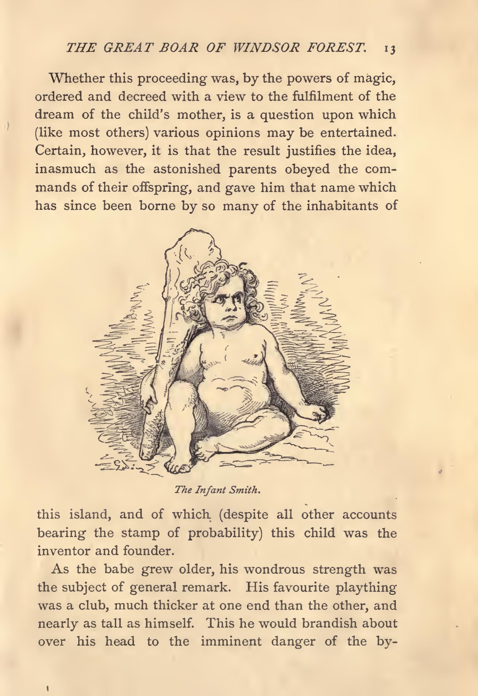 A poor woman of the neighbourhood dreamed that she was about to become the mother of the largest family that the world had ever seen. This being a thing which her husband, being in straitened circumstances, deemed by no means desirable, he received the news with disgust only tempered by disbelief, and treated his helpmate to language of a rough and discourteous character. His frame of mind changed, however, when, as years rolled on, one child only claimed him for its father, which of course entitled him to sneer at his wife and her dreams as a good husband would naturally do under such circumstances. The child, however, was one of no ordinary description. Not only was he the largest and most strongly made child ever seen in these parts, but he showed from an early age a singular and precocious intelligence. Before the time when infants are supposed to be able to convey their meaning to their friends by intelligible utterances, a very remarkable instance of this precocity occurred. The father and mother (whose names have not been handed down to posterity) were discussing the future of their promising babe in his presence, and one asked of the other the question what distinguishing name should be given to so fine a child. The astonishment of the parents may be imagined when the infant, suddenly sitting upright in his mother’s lap, and steadfastly regarding his father, winked his left eye violently, laid the first finger of his right hand against his little nose in a confidential manner, and emphatically pronounced the word “Smith.”