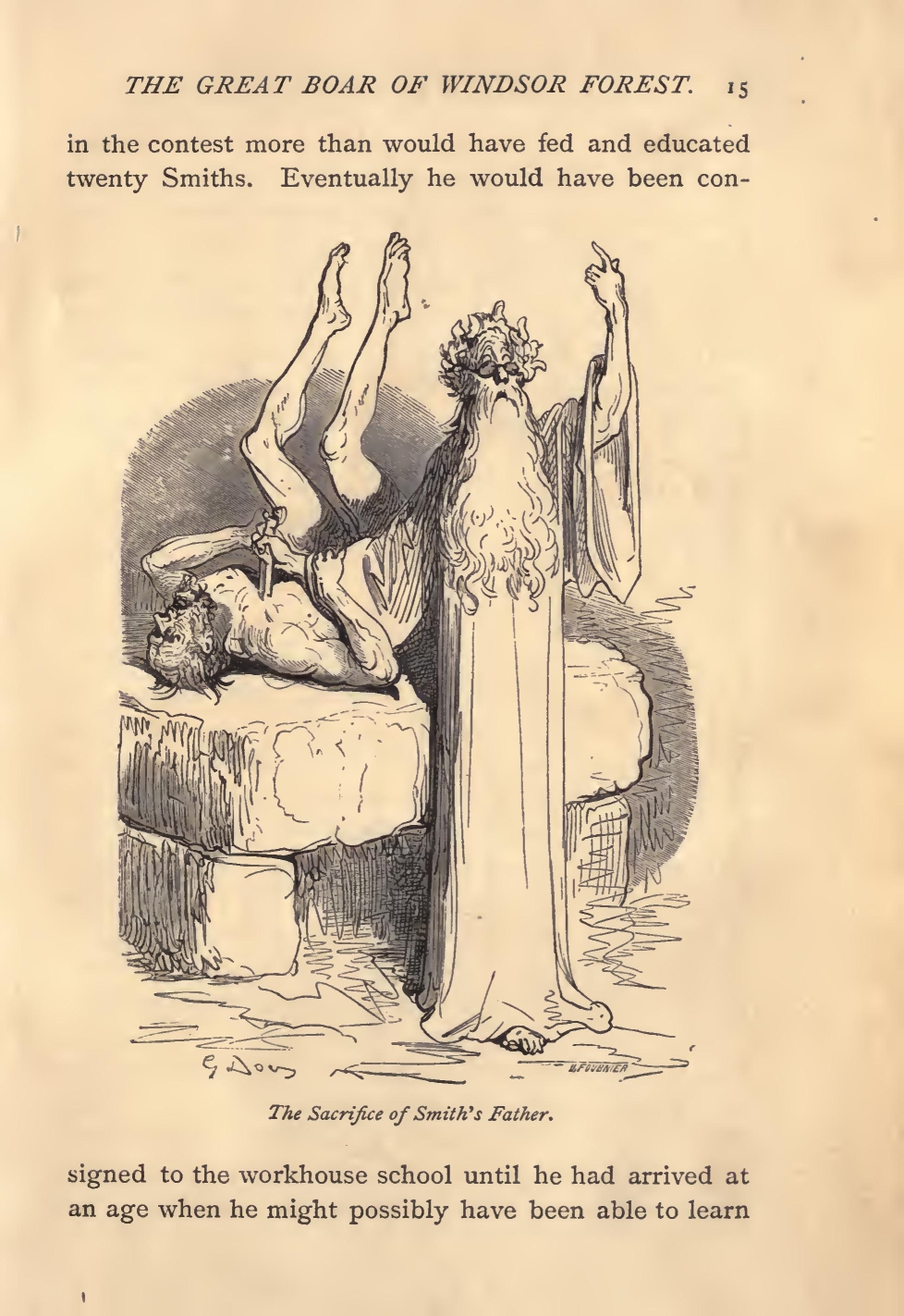 The venerable Druid who had sacrificed the child’s father took no trouble about the child, though he would probably have sacrificed him too with the greatest pleasure had any hint been given him upon the subject. The people who had permitted and sanctioned the deed never gave a thought to the infant who had thereby been left destitute. Public opinion was not in existence, and as this island had not then, as it has now, what is popularly called “the blessing of a Free Press,” the attention of the neighbourhood was not called to such trifling occurrences. So Smith’s father perished and Smith disappeared, without notice or remark from anybody. What really happened to the lad is known, of course, to me, and is sufficiently laughable. He wandered into the forest, and became the friend and companion of the toads, for which Windsor has always been famous.
