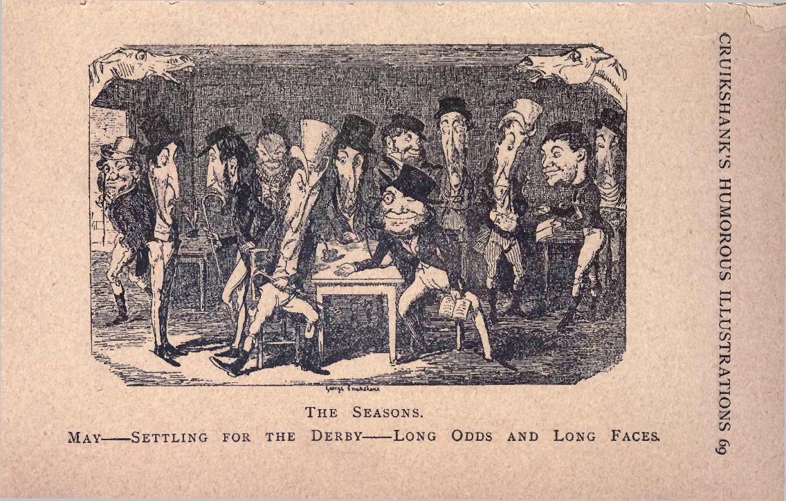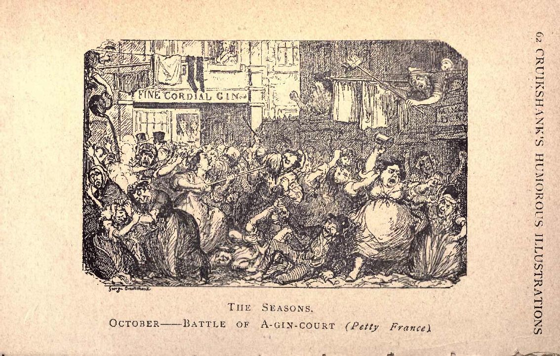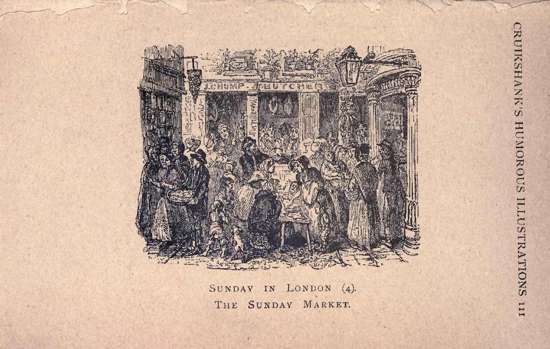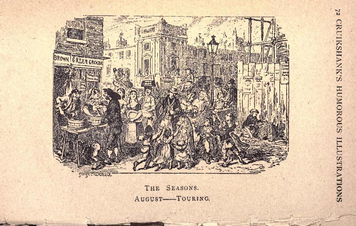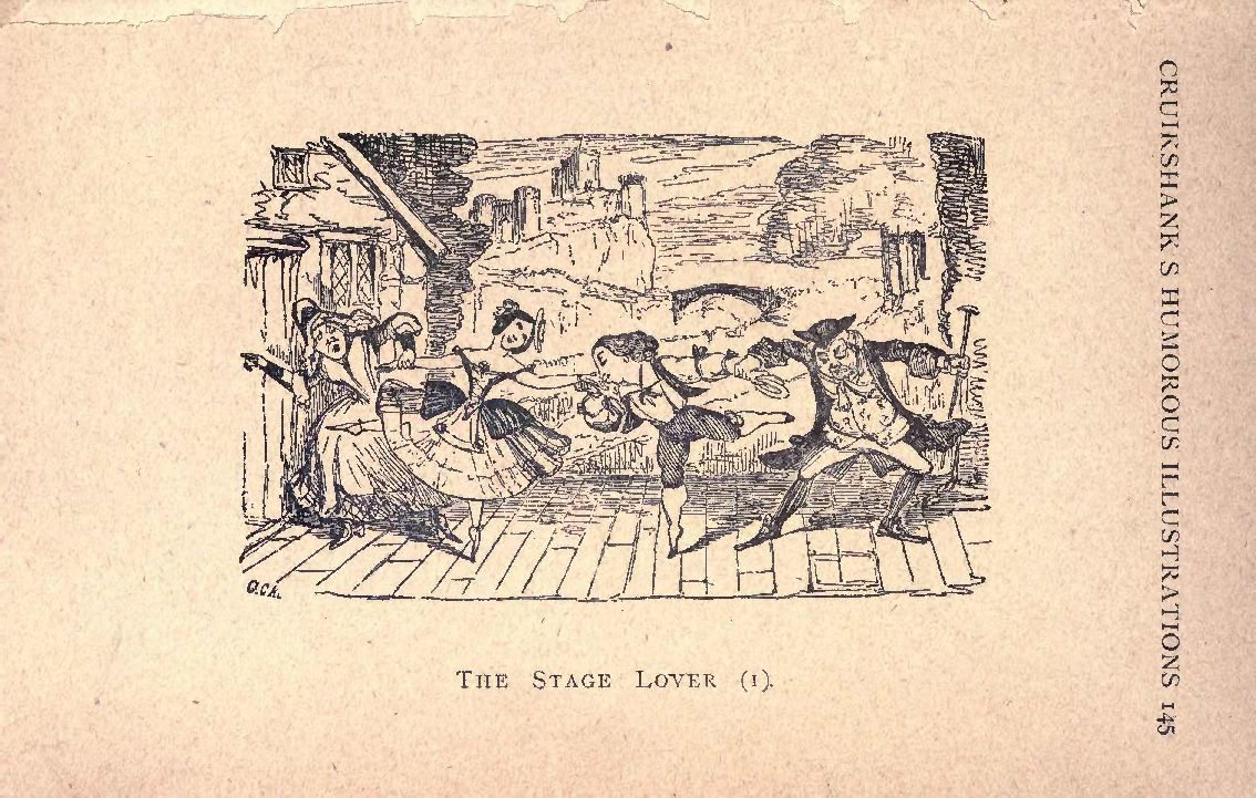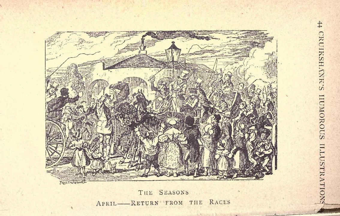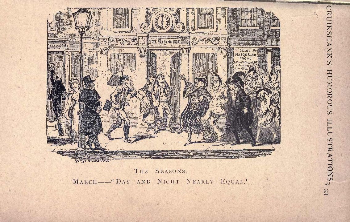 He is described at this early age as filled with a reckless love of adventure, emulating the exploits of Tom and Jerry, with wild companions. His field of observation extended from the foot of the gallows to Greenwich fair, through coal-holes, cider-cellars, cribs, and prize-fighters' taverns, Petticoat Lane, and Smithfield. Its centre was Covent Garden Market, where the young bloods drank, and sang, and fought under the piazzas in those days. Such was pretty much the sort of education the young men had, and luckily George had the sense and talent to turn it all to good account later on with his pencil.