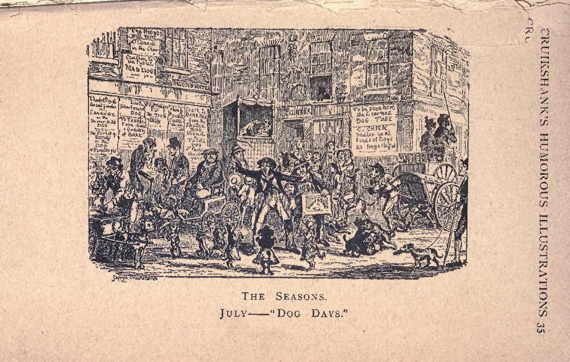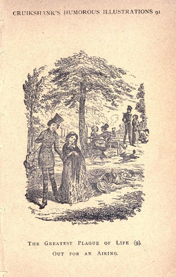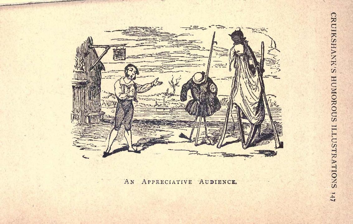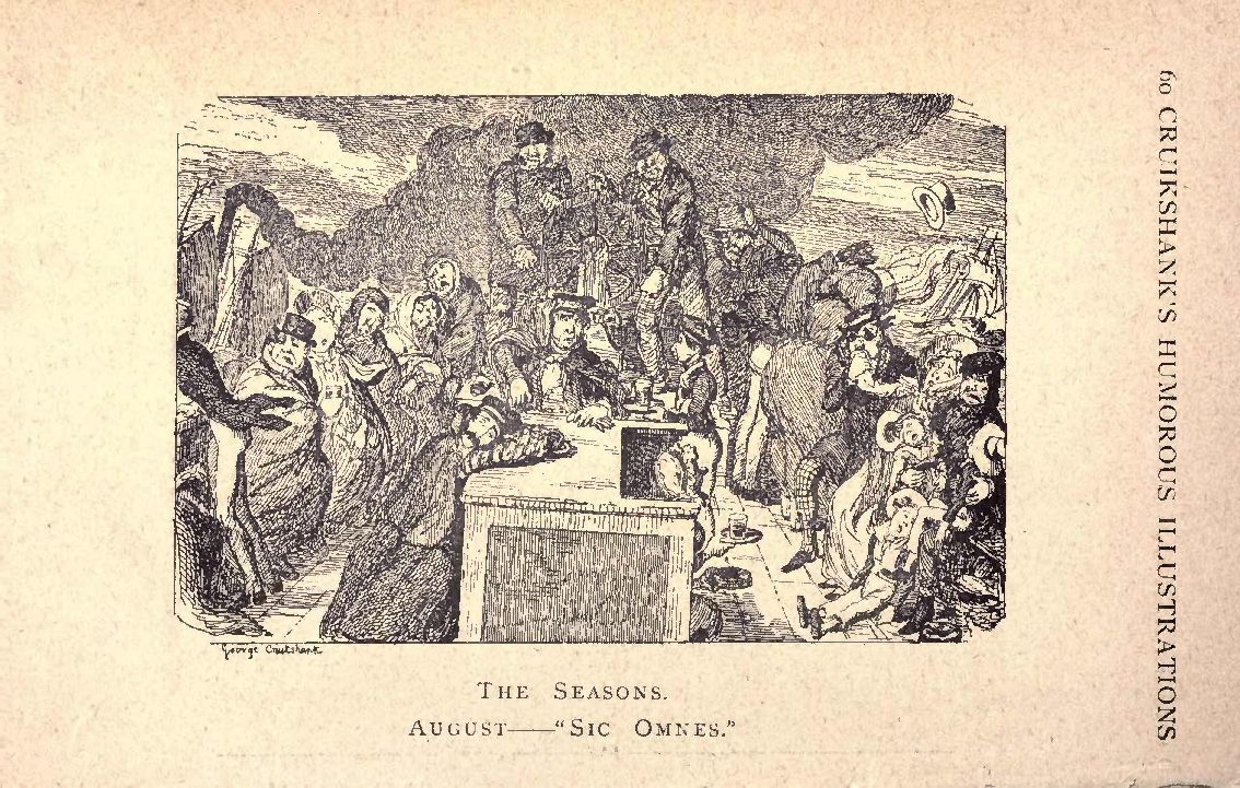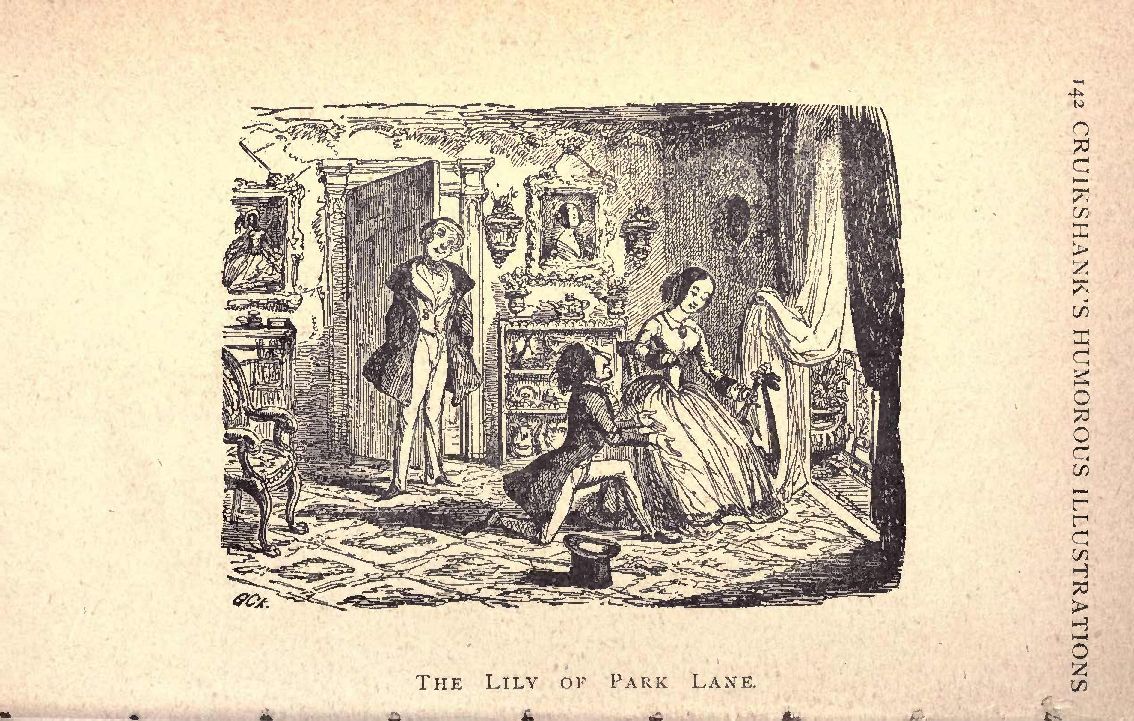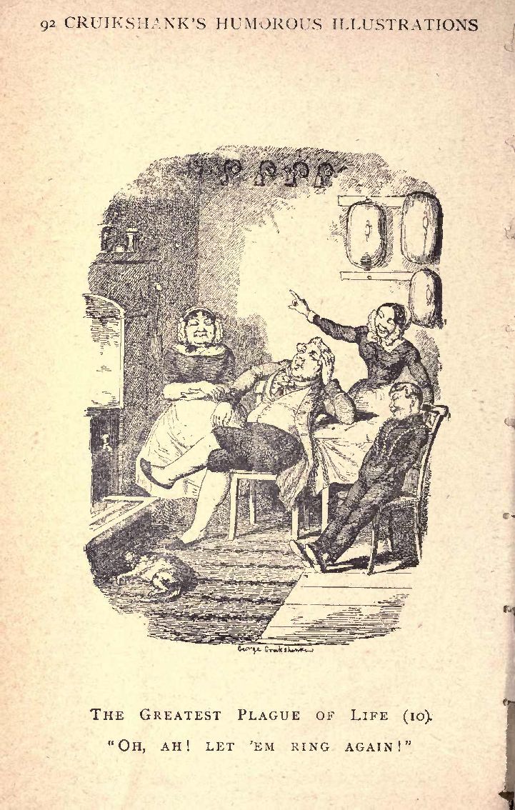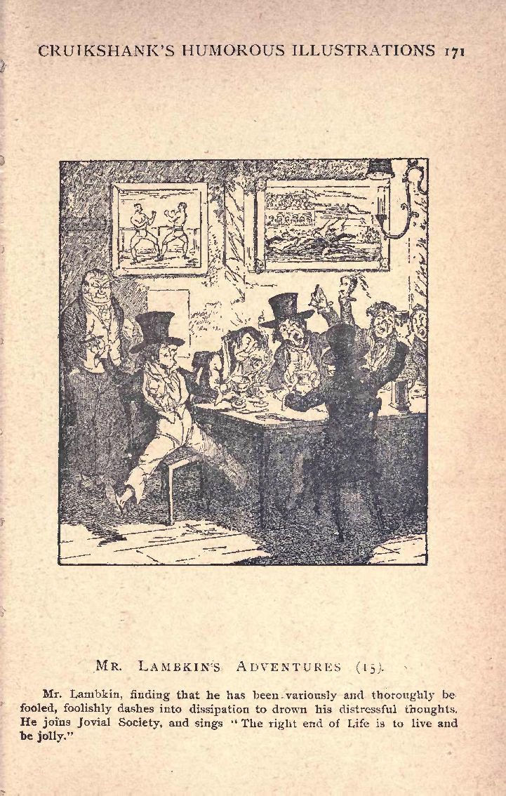 In course of time the artist was firmly established in business, and had numerous patrons among the publishers, some of whom were thriving to a considerable extent through Cruikshank's labours. After numerous isolated sketches, which brought him no small amount of fame, the first considerable series of designs by him appeared in Dr. Syntax's Life of Napoleon, consisting of thirty illustrations. Another long series was twenty-three illustrations to Pierce Egan's Life in London. As also twenty-seven etchings to Grimm's Popular Stories. These were followed by numerous other lengthened series, such as Mornings at Row Street, Three Courses and a Dessert, Punch and Judy, Gil Blas, My Sketch Book, Scott's Novels, Sketches by Boz, The Omnibus, and very numerous others. In all, he appears to have produced the illustrations for no fewer than three hundred and twenty volumes, not to speak of an immense number of isolated sketches of all sorts.