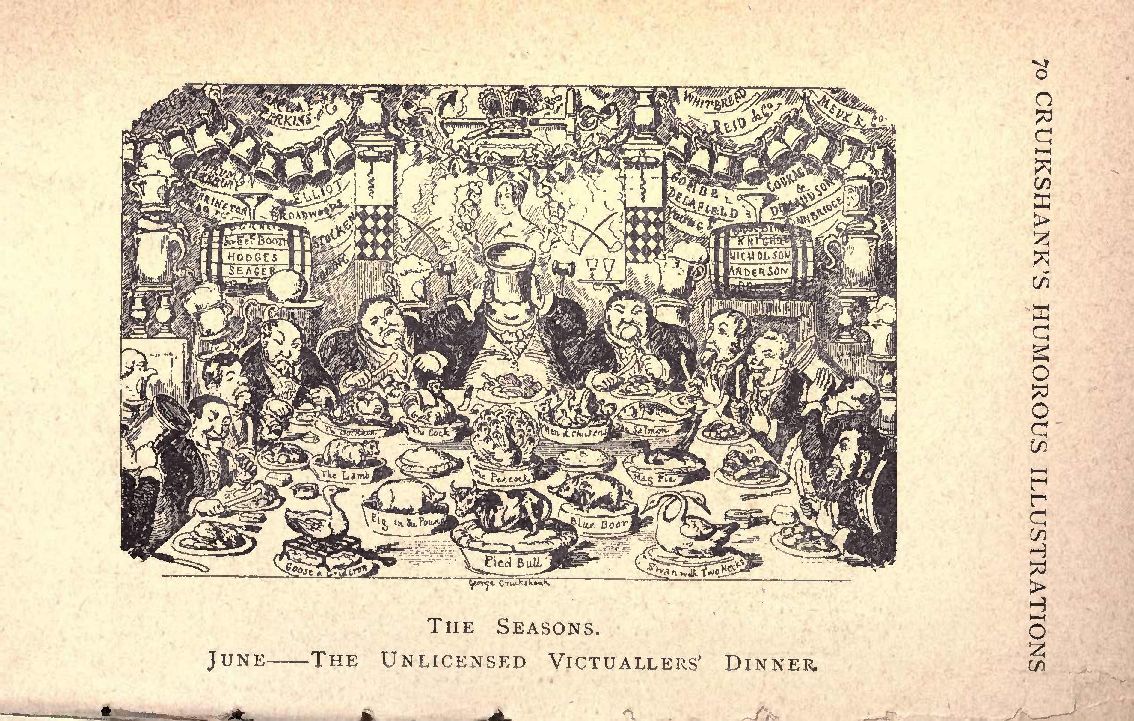 In Cruikshank's later years he made a good many attempts at oil painting, and exhibited quite a number of paintings at the Royal Academy all with more or less success. But the larger and best known of these is the "Worship of Bacchus;" it is a work of inexhaustible detail and invention, and was received by the public with great favour; the size is 7 feet 8 inches high by 13 feet 3 inches long, and it is now in the National Gallery.