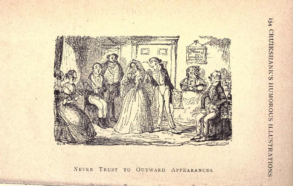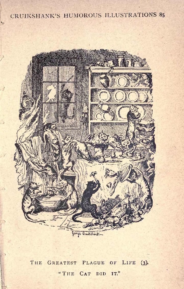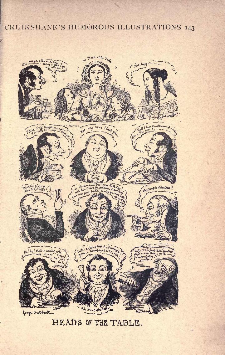 The old school of caricaturists in which the names of Gilray, Rowlandson, Woodward, and Bunbury are most prominent, was noted chiefly for the broad, and in many cases, vulgar treatment of the subjects which were dealt with. The later school of caricaturists, in their mode of treating similar subjects, differed considerably from their predecessors. The leading member of the new school was George Cruikshank. He lived and worked during two generations, and may be considered as the connecting link between the old school and the new. At first Cruikshank to some extent followed Gilray and Rowlandson, but gradually fell off from their style of art, and in its stead produced work of a more serious and more artistic nature, which was the beginning of a new era in the history of caricature. His illustrations to innumerable works are of the highest order, and have made for him an everlasting reputation.